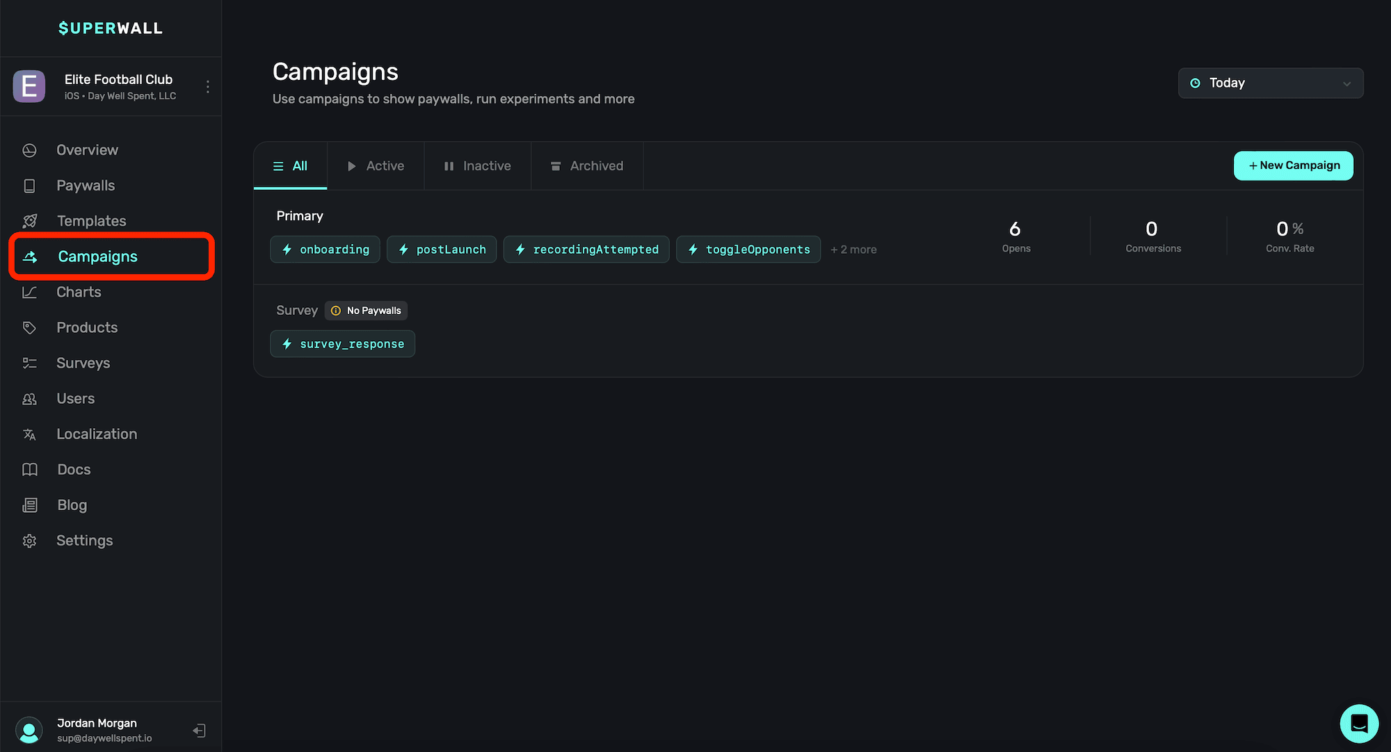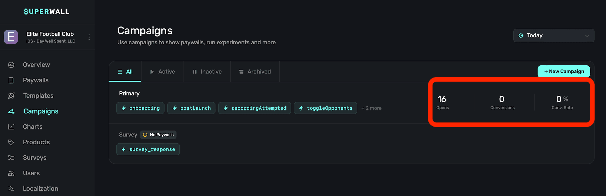 - Inactive: Campaigns that are not serving paywalls in production, but can be quickly re-enabled.