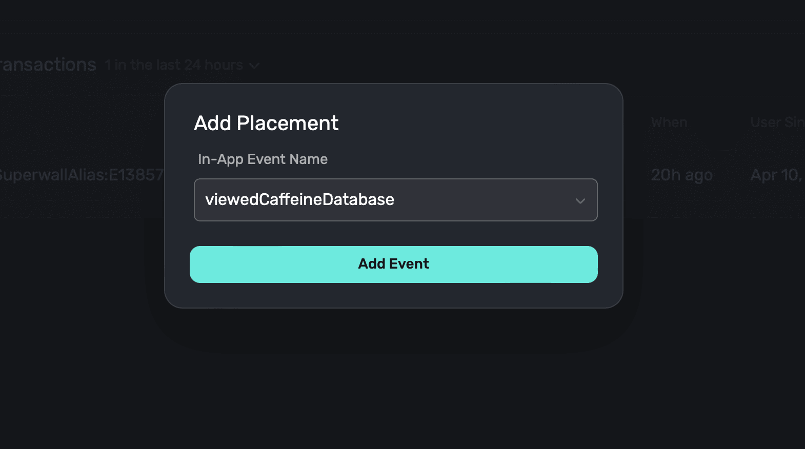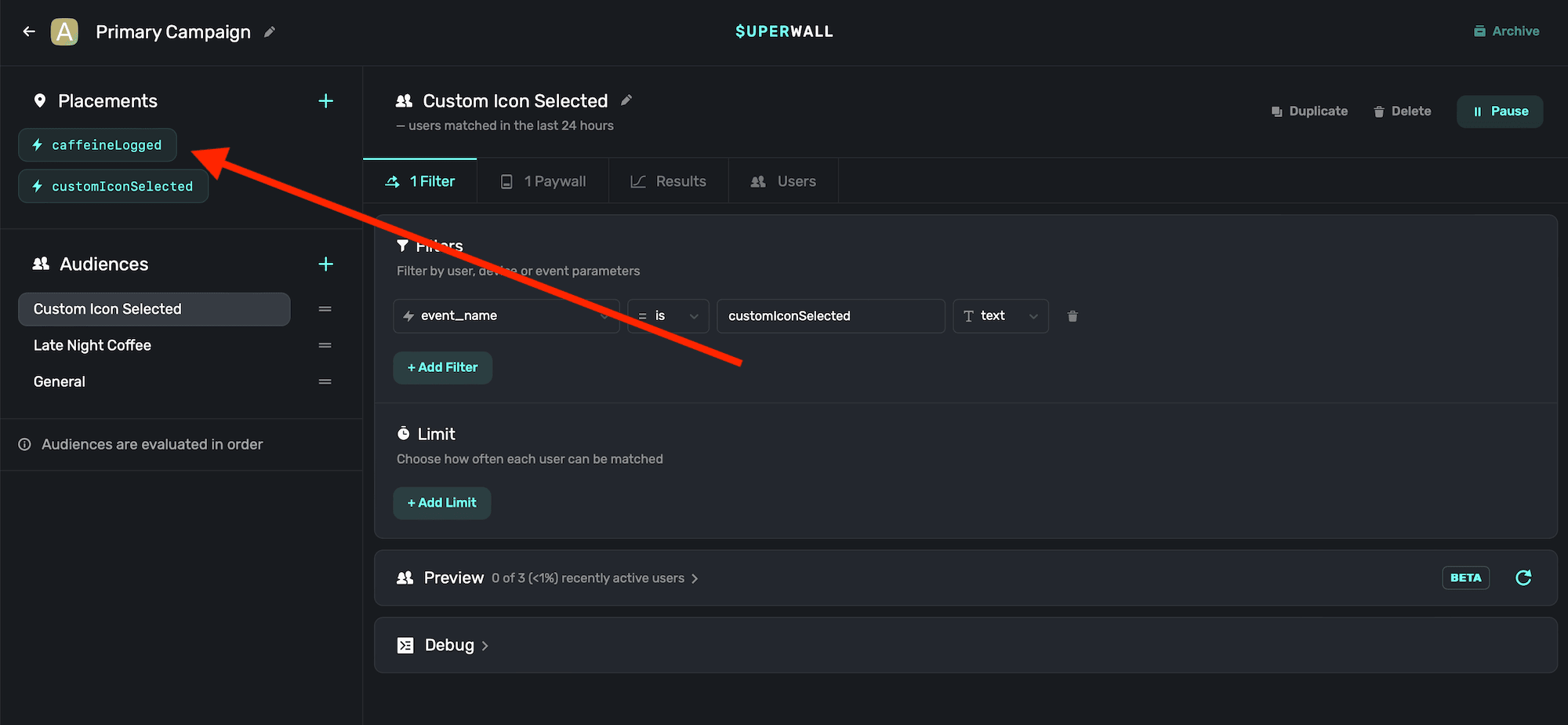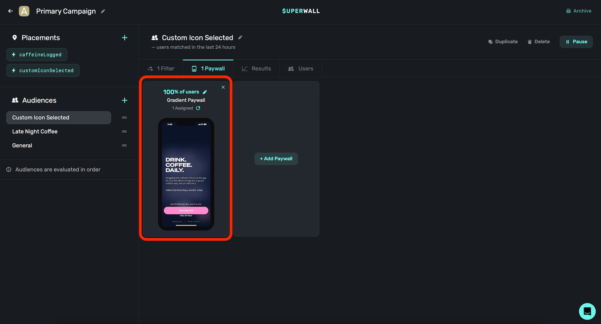 Remember, you can pause placements at any point. So here, if you wanted to run a campaign where logging caffeine was free for a weekend — no update would be required. Just tell your users, and pause the placement in your Superwall dashboard. No app update required.