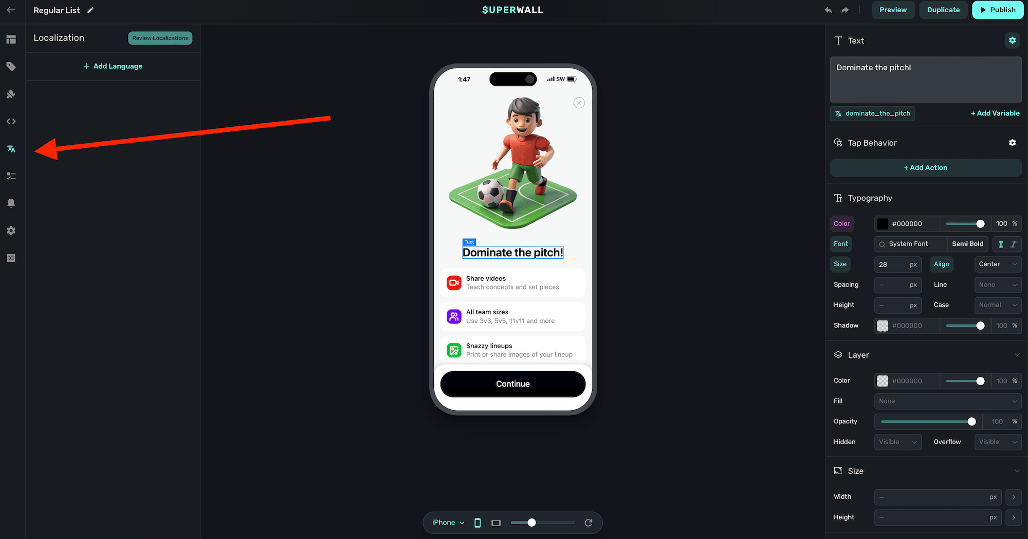 - Simple: Here, you can use AI to localize your paywall into any language. You can manually refine each value at any point. Quick and accurate.