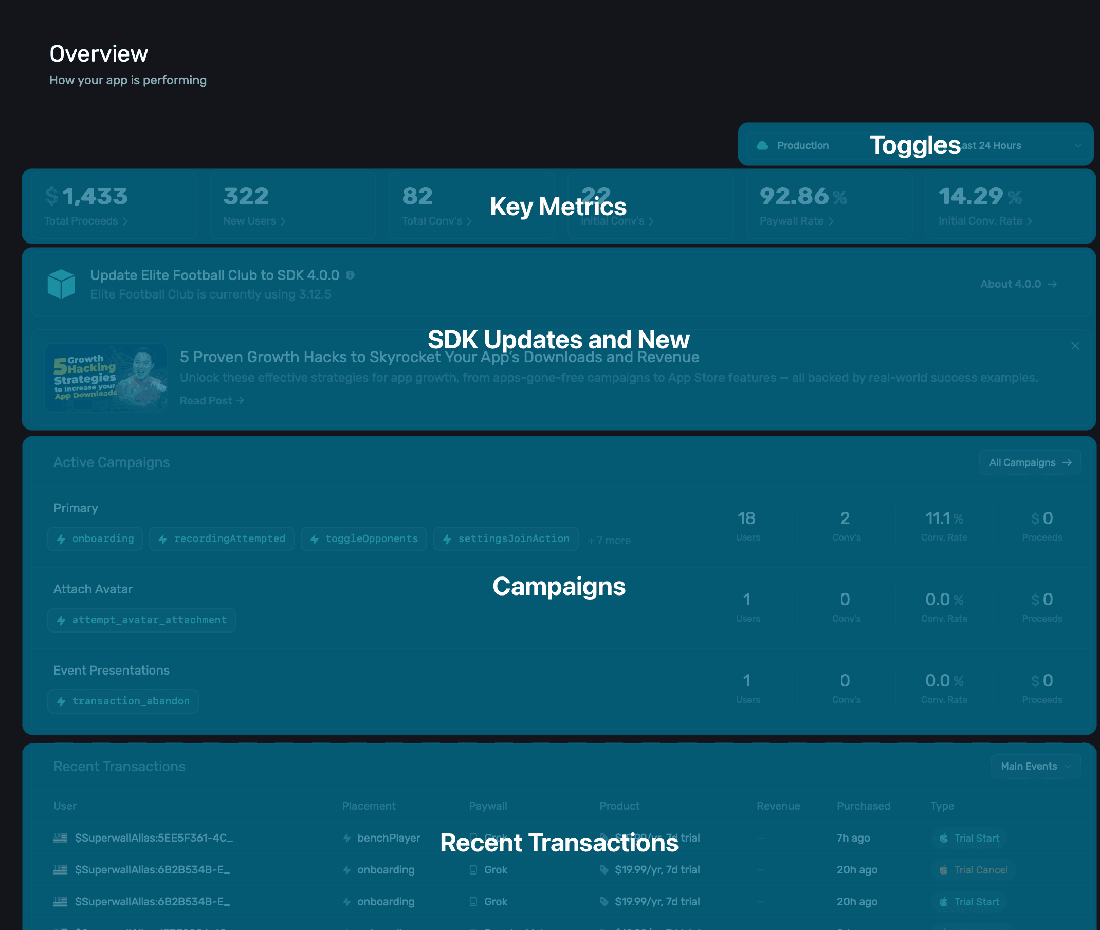 Once you've logged into Superwall, you'll be taken to the Overview page. Here, you can view key metrics and important campaign performance about your app.