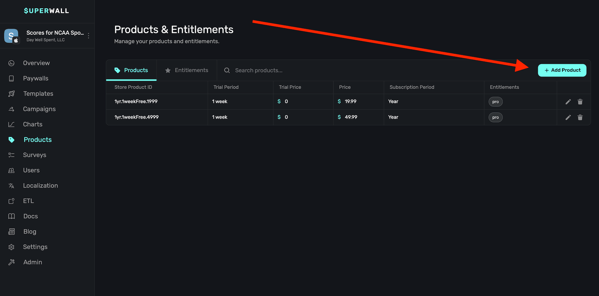 At this point, you can go back to your products and attach one or more entitlements to each one.