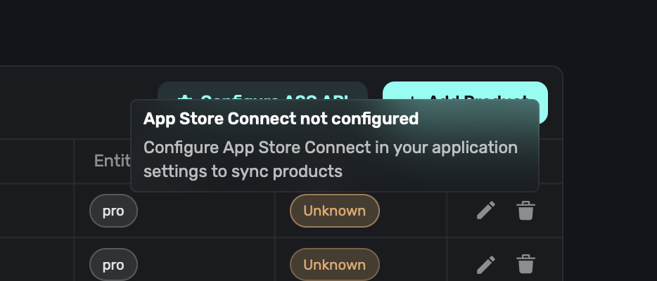 Your products, whether live or pre-release, shouldn't be in the "Missing Metadata" state. If they are, you won't be able to test them on device. To fix this, make sure your products are in the "Ready to Submit" or "Approved" state. Superwall will automatically warn you if they are in this state when you have the App Store Connect API set up:
